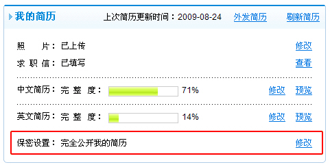 进入《个人管理中心》首页,位于左下角的《我的简历》,如下图所示,点击《修改》